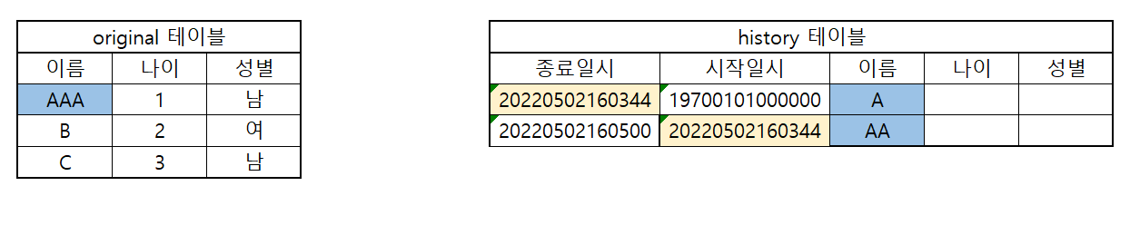 향후 이력테이블의 변경사항을 조회할 때 특정 시점을 종료일시와 시작 일시의