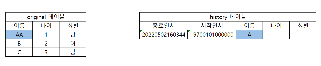 ⊙ original 테이블의 수정된 데이터 AA -> AAA로 변경시