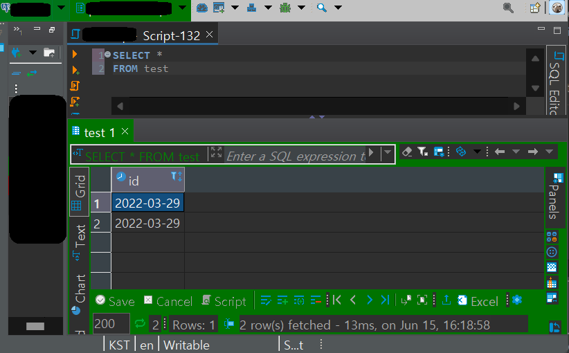 개발서버 -> Test 클릭 : 개발 디비 초록색 변경