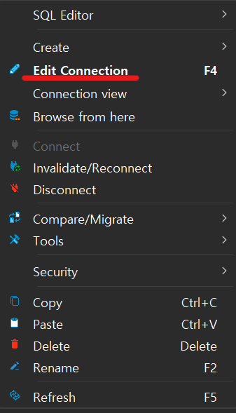 1. 네비게이터 바에 연결된 디비 우클릭해서 Edit Connection 클릭